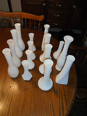 Title (ebay affiliate link): Mix Lot of 15 White Milk Glass Bud Vases Vintage Wedding Shower Florist 6"-10.5"