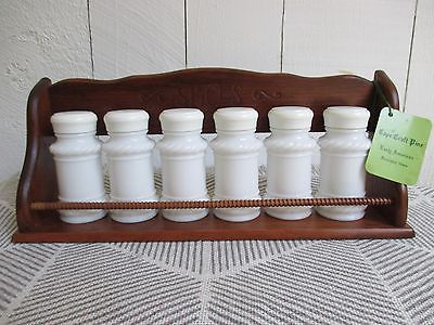 Vtg Wood Spice Herb Rack Cabinet w/ 6 Milk Glass Apothocary Jars 1 Shelf NOS