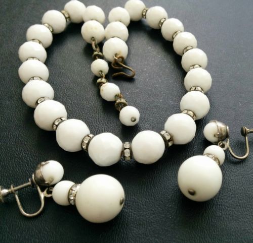 Title (ebay affiliate link): Vintage Heavy Faceted Milk Glass Rhinestone Disco Bead Necklace Earring SET 28