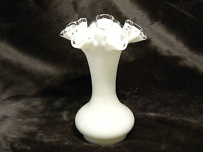 Title (ebay affiliate link): FENTON WHITE MILK GLASS VASE CRIMPED RUFFLE WITH CLEAR GLASS EDGE