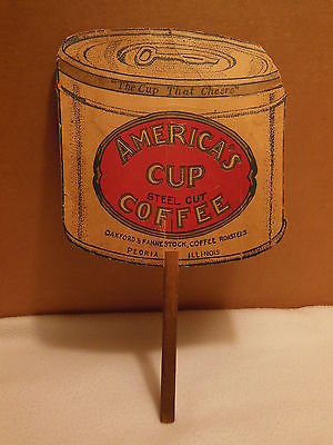 VINTAGE ADVERTISING HAND FAN AMERICA'S CUP STEEL CUT COFFEE CAN PEORIA, ILLINOIS
