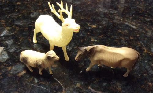 3 Vintage Celluloid Nativity Animals Deer Ram Cow Mint Condition