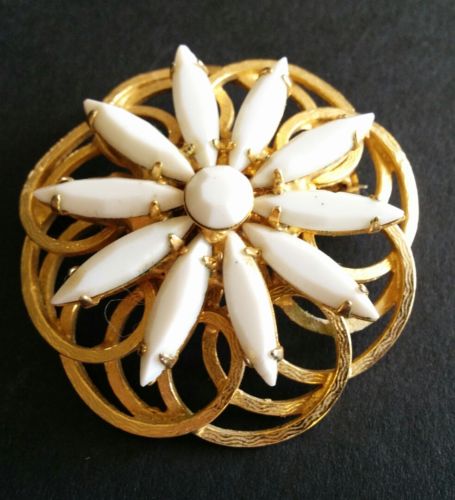 Title (ebay affiliate link): Vintage Brooch Pin Flower Milk Glass Navette Gold Tone Swirl S1098