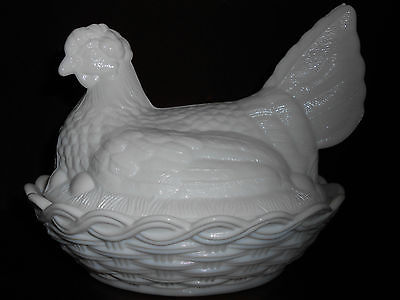 White Milk glass hen chicken on nest basket candy butter dish rooster opaque art