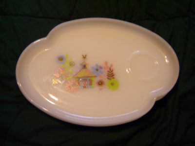 milk glass snack plates (4) w/pic of house and rooster