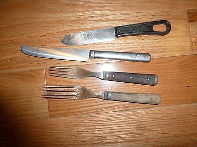 Primitive Flatware -Two Wood Handle Forks + U S Navy & U.S. Knives