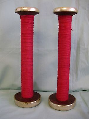 2 VINTAGE WOOD MILL SPOOLS BOBBINS W/YARN, BRASS ENDS 9 INCHES TALL