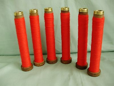 6 WOODEN, WOOD TEXTILE MILL SPOOLS, BOBBINS WITH YARN BRASS END