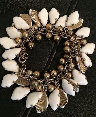 Title (ebay affiliate link): Vintage Milk Glass Goldtone Seashell design back Dangle Bracelet