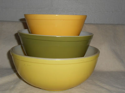 Vtg Pyrex Mixing Nesting Bowl Set 3 Green Yellows Milk Glass 4qt 2 1/2qt 1 1/2qt