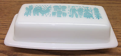 Vtg Pyrex covered BUTTER DISH White Milk Glass Amish Country Blue Butterprint