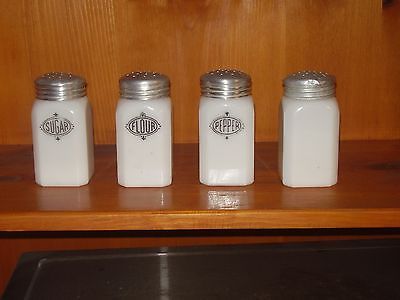 Title (ebay affiliate link): 4 Vintage White Milk Glass Pepper/Flour/Sugar/ Plain Shakers