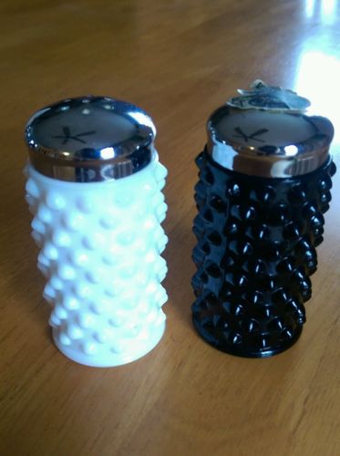 Title (ebay affiliate link): Rare Black and White Fenton Milk Glass Salt & Pepper Shakers - Hobnail Pattern