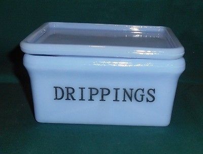 DRIPPINGS COVERED SAVINGS DISH Delphite Blue Milk Glass Grease Jar Rectangle