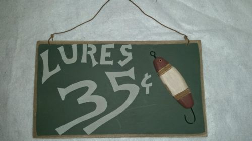 Title (ebay affiliate link): VINTAGE STYLE FISHING LURES 35 CENT WOODEN SIGN MAN CAVE RUSTIC CABIN WALL DECO