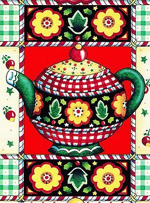 Christmas Teapot Red White Check Flower Green Fridge Magnet Mary Engelbreit Art