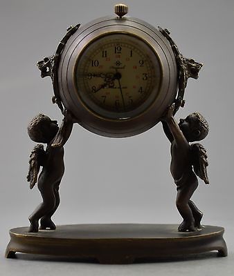 Collectible Decorated Old Copper Carved Pair Child Held Mechanical Table Clock
