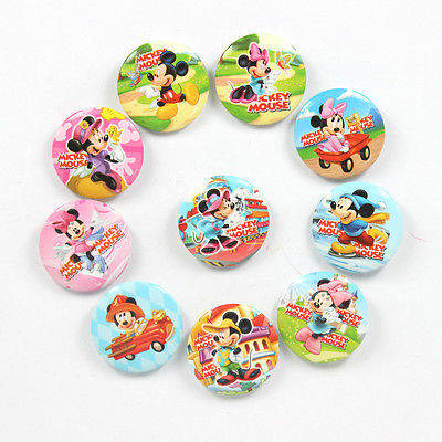 Title (ebay affiliate link): 10pcs Minnie & Mickey Buttons Pins 30MM Round Brooch Badges Kids Birthday Gift