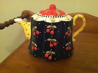 Teapot, signed Mary Engelbreit 2001 large black with red cherries