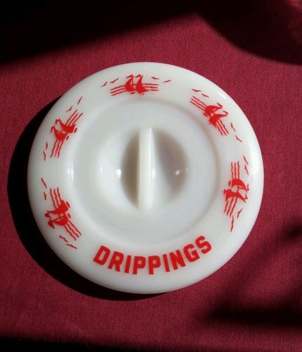 Title (ebay affiliate link): Vintage 1940's McKee Red Ships Sailboats Milk Glass 'Drippings' Jar Lid only