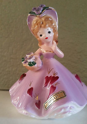 Vintage Josef Originals February Figurine Purple Dress Hearts Bonnet Black Eyes