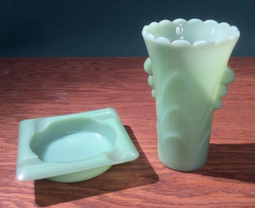 Title (ebay affiliate link): Antique Jadeite Milk Glass Light Green Ashtray & Art Deco Vase