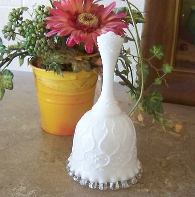 Title (ebay affiliate link): Vtg Fenton Silver Crest Spanish Lace Milk Glass Bell Crystal Ruffle Rim Clapper