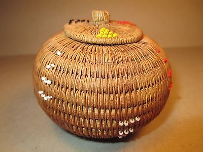Vintage Handmade Woven Pine Needle Basket Beaded Intricate Tight Weaving 3-1/4"