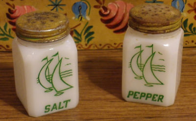 VINTAGE Milk Glass Salt & Pepper with Sailboats