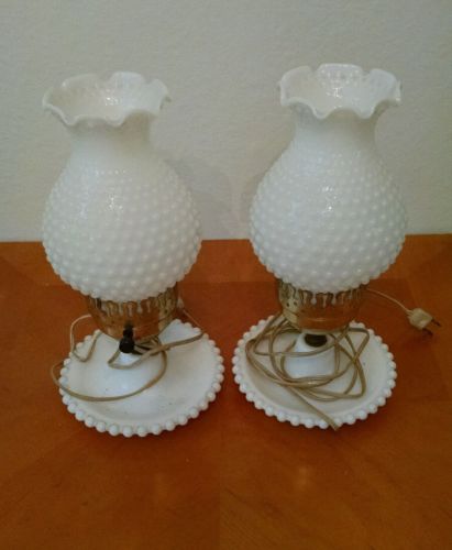 Title (ebay affiliate link): Pair of Vtg Milk Glass Hobnail Small Electric Table Lamp White Hurricane Chimney