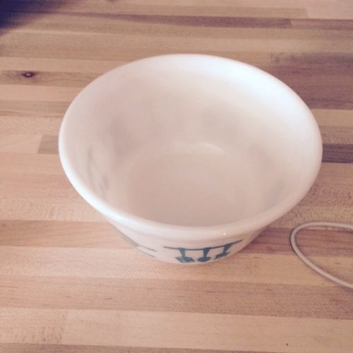 Title (ebay affiliate link): Hazel Atlas Milk Glass Scalloped Bowl with Turquoise Kitchen Utensils