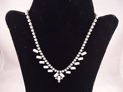 Vintage Weiss Milk Glass & Rhinestone Silvertoned Prong Set Necklace 7-1/2" Drop