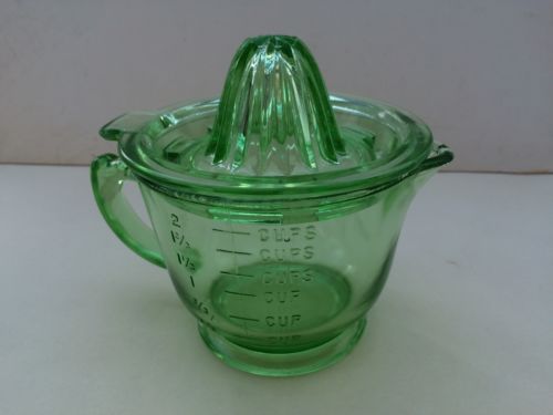 Title (ebay affiliate link): Vintage Green Depression Glass Reamer and 2-Cup Measure and Mixing Cup
