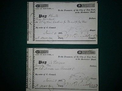 1827, William Paulding, General, Mayor Of New York, Signed Pair of Checks