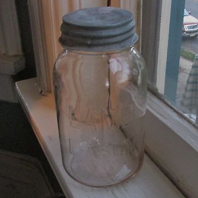 Title (ebay affiliate link): Vintage Lamb Mason Clear Glass Quart Fruit Jar & Zinc Lid