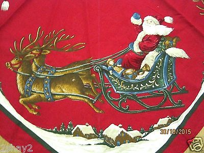 CHRISTMAS TREE SKIRT ABOUT 33 ACROSS w/Lg SANTA, SLEIGH, & REINDEER AT CORNERS
