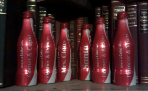 Title (ebay affiliate link): Coca-Cola Santa, Mrs Claus and 8 Reindeer 8oz Aluminum Bottles.with ornament top