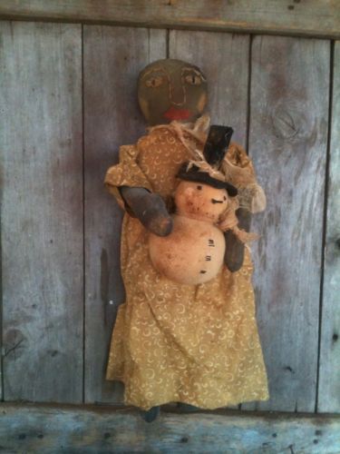 Title (ebay affiliate link): Primitive folk art doll with her snowman mustard calico grungy extreme prim
