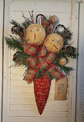 Primitive Hanging Santa Hat w/ Snowman faces, Pip berries, long Greeter