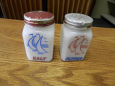 Vintage McKee Tipp City White Milk Glass Salt Pepper Shakers with Sailboats 1940