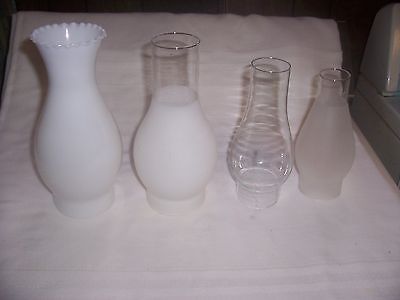 Title (ebay affiliate link): VINTAGE CHIMNEYS FOR OIL LAMPS 4 MILK GLASS WHITE FROSTED CLEAR FROSTED 1CLEAR