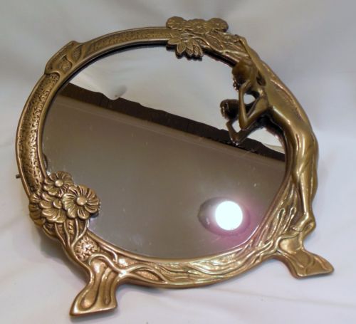 Vintage ART NOUVEAU Barbola Lady Brass Table or Wall Mirror 12"