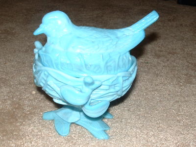 VINTAGE BLUE SLAG MILK GLASS DOVE ON NEST, BIRD ON NEST