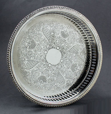 Vintage silver plate round embossed floral gallery drinks serving tray 23 cm