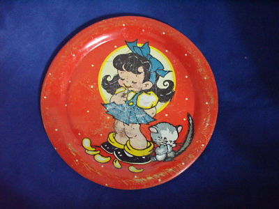 CHILD'S TIN PLAY DISH GIRL WITH KITTEN CUTE