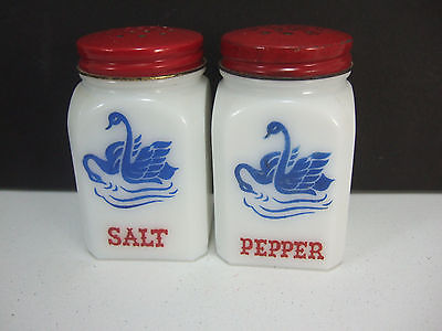 Vintage Hazel Atlas/Anchor Hocking Milk Glass Swan Salt & Pepper Shakers Red Top