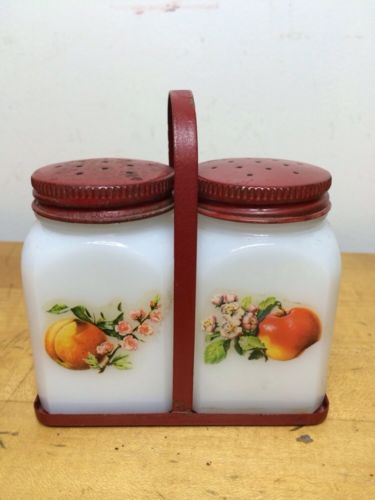 Title (ebay affiliate link): Nice Vintage Milk Glass Salt & Pepper RED APPLE Table Shakers With Carrier