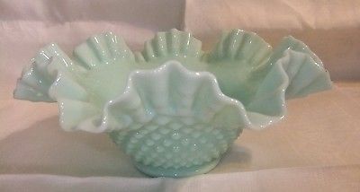 Title (ebay affiliate link): Vintage Aqua Milk Glass Hobnail Bowl with Ruffled Edge, Circa 1941