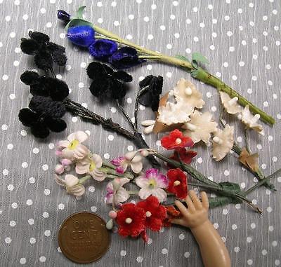 Antique French Fashion Doll Assortment TINY Millinery Flowers Velvet Hat Vtg
