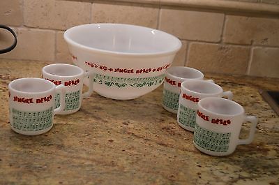 Vintage Hazel Atlas Jingle Bells Egg Nog Christmas Milk Glass Punch Bowl/ 5 Mugs